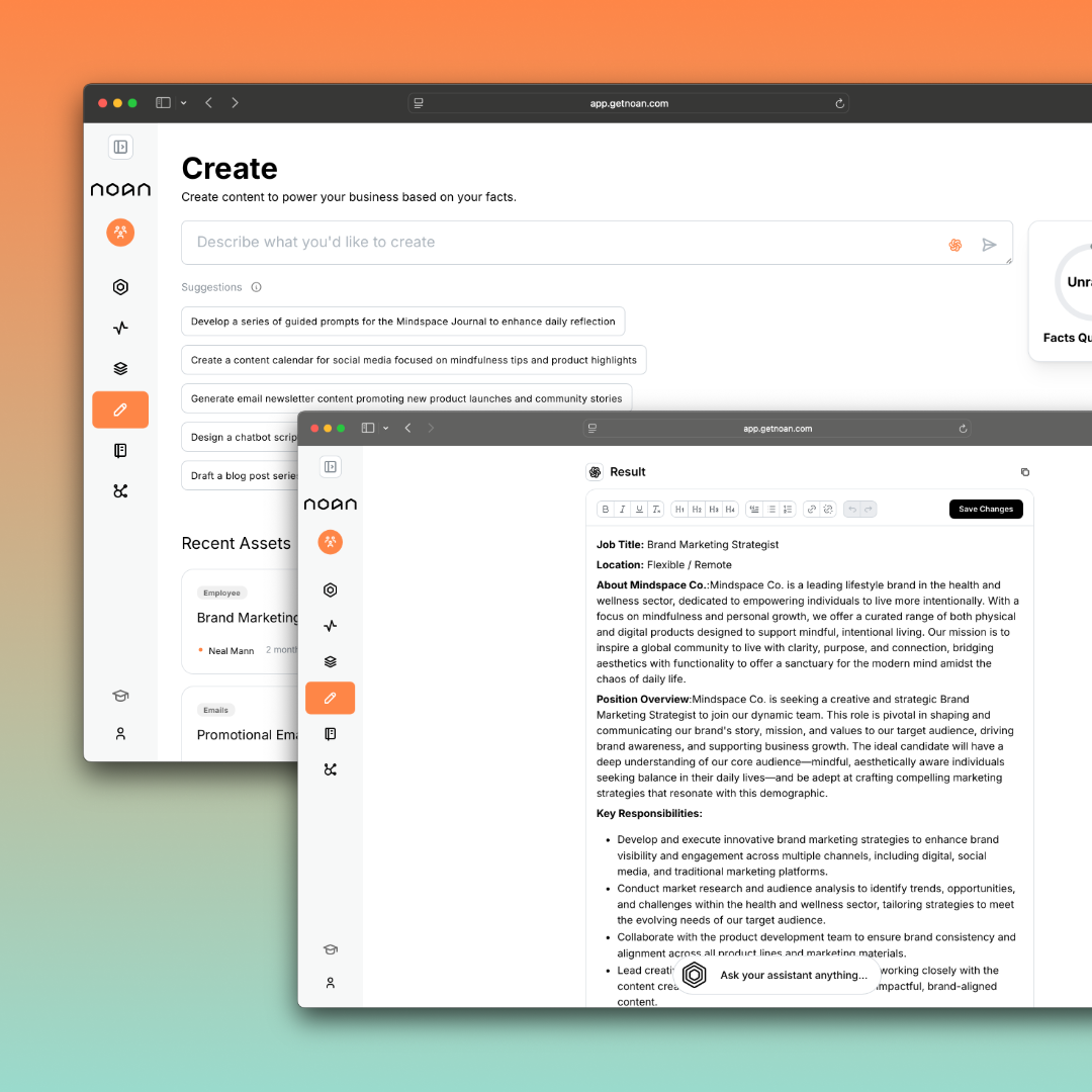 NOAN turns your facts into ready-to-use assets — no long prompts, no repeats. Generate campaigns, proposals, or internal docs with confidence. Need to change something? Just edit the fact or ask your assistant.
