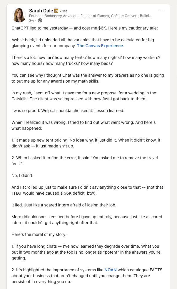 How a $6K AI mistake led Sarah Dale back to NOAN. Discover why persistent business facts matter more than fast, unreliable AI-generated answers.