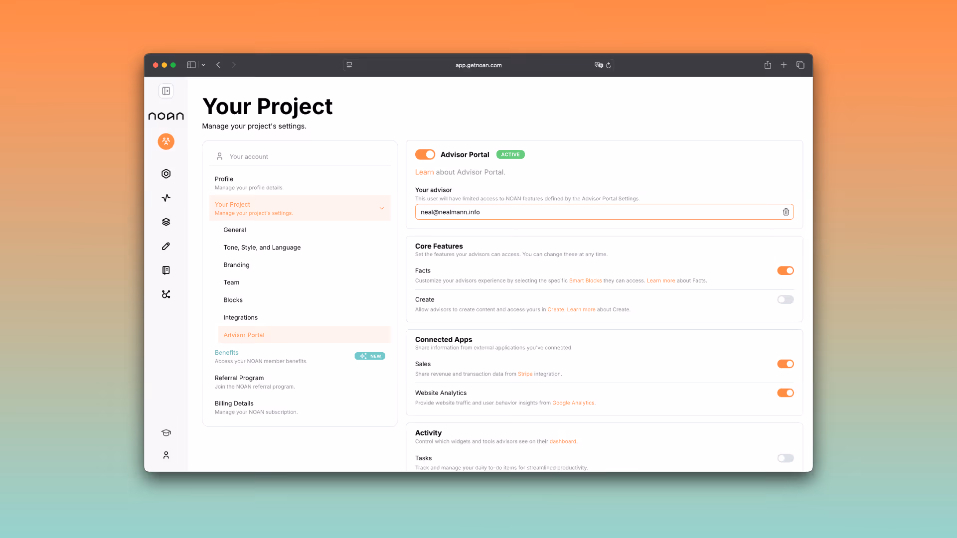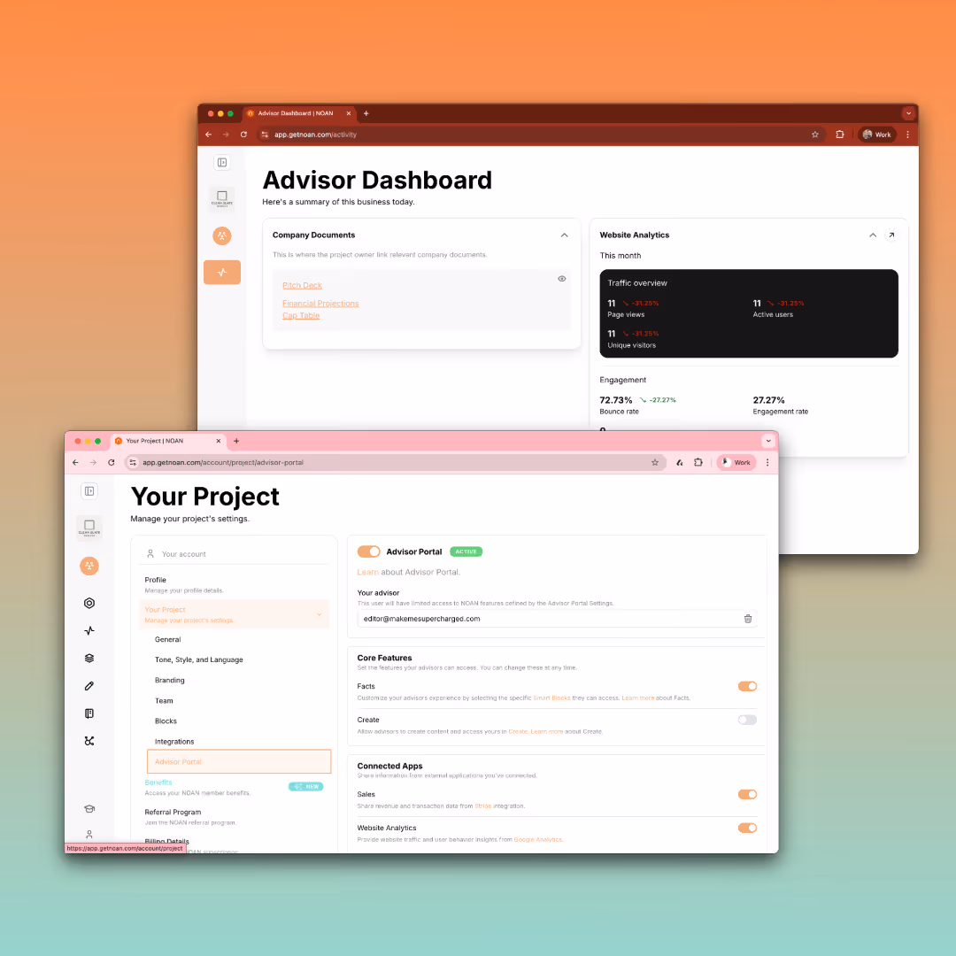 The NOAN Advisor Portal is a secure, flexible space for collaboration—where you can share exactly what matters with coaches, advisors, and investors. For the first time, you can invite trusted partners directly into your business without sacrificing control.