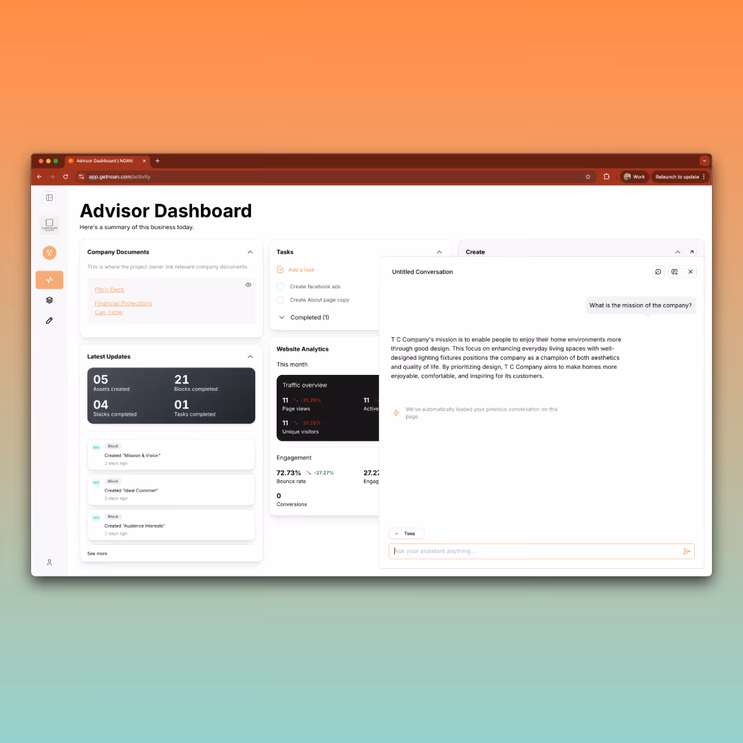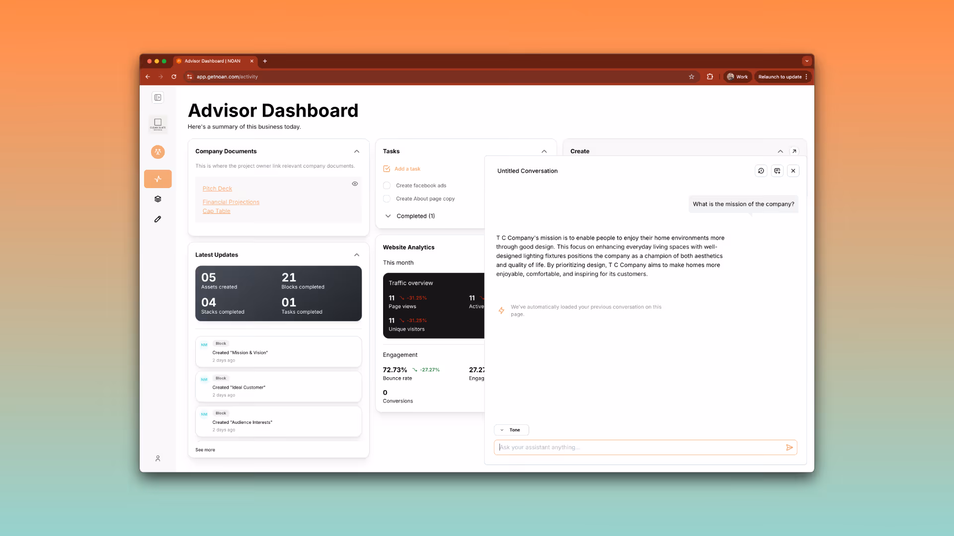 When advisors step into your NOAN workspace, they’re not guessing in the dark. They see your curated knowledge, real-time analytics, and relevant updates—so every conversation is informed, strategic, and actionable.