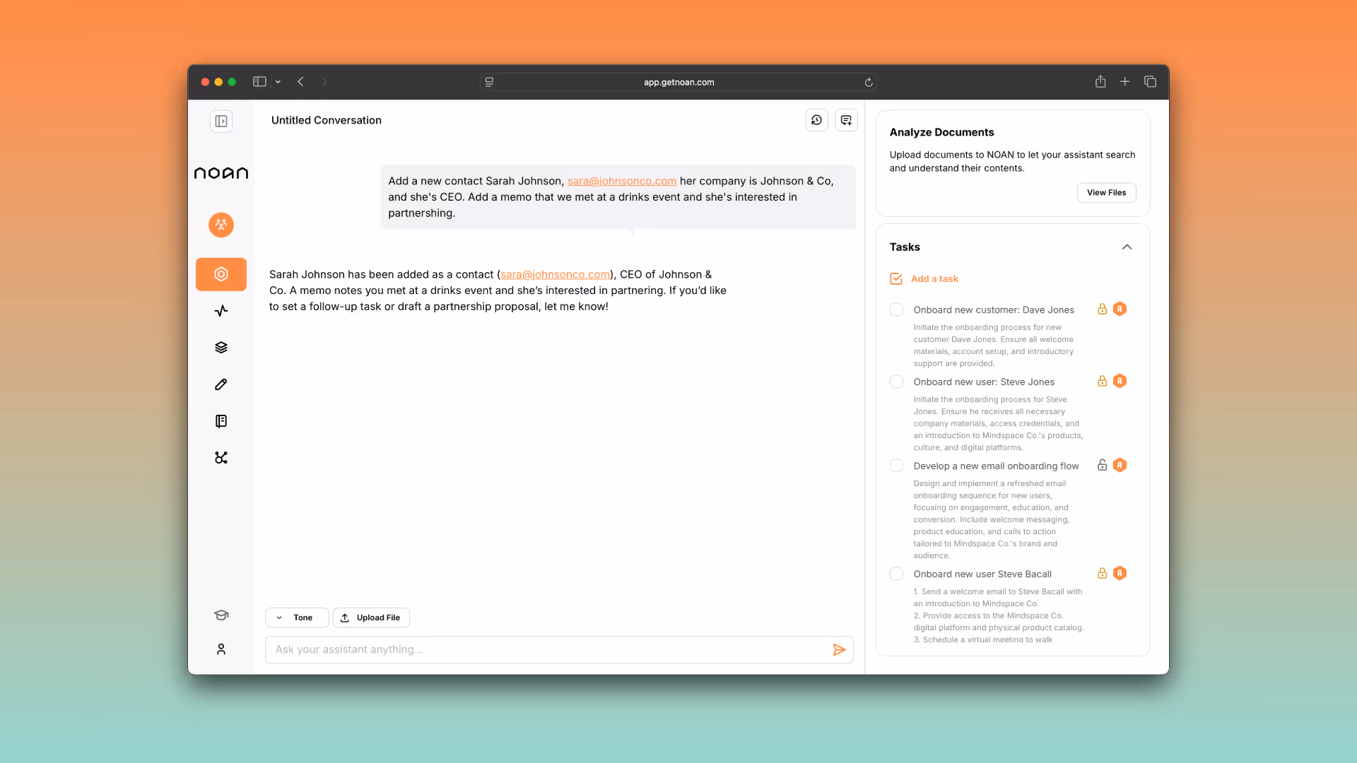 Ask your NOAN Assistant to create, update, or recall any contact on the spot. It knows the context of your business and your network, so it can surface exactly who you need, when you need them—no digging required.