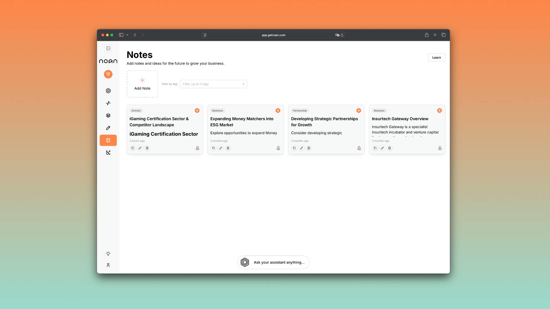 When you’re working with the NOAN assistant, you’ll generate a stream of valuable ideas, research, and insights. Instead of scrolling endlessly through old conversations, you can save the best bits as Notes. This way, you can instantly recall them later, turn them into actionable facts, or use them as the foundation for new content.